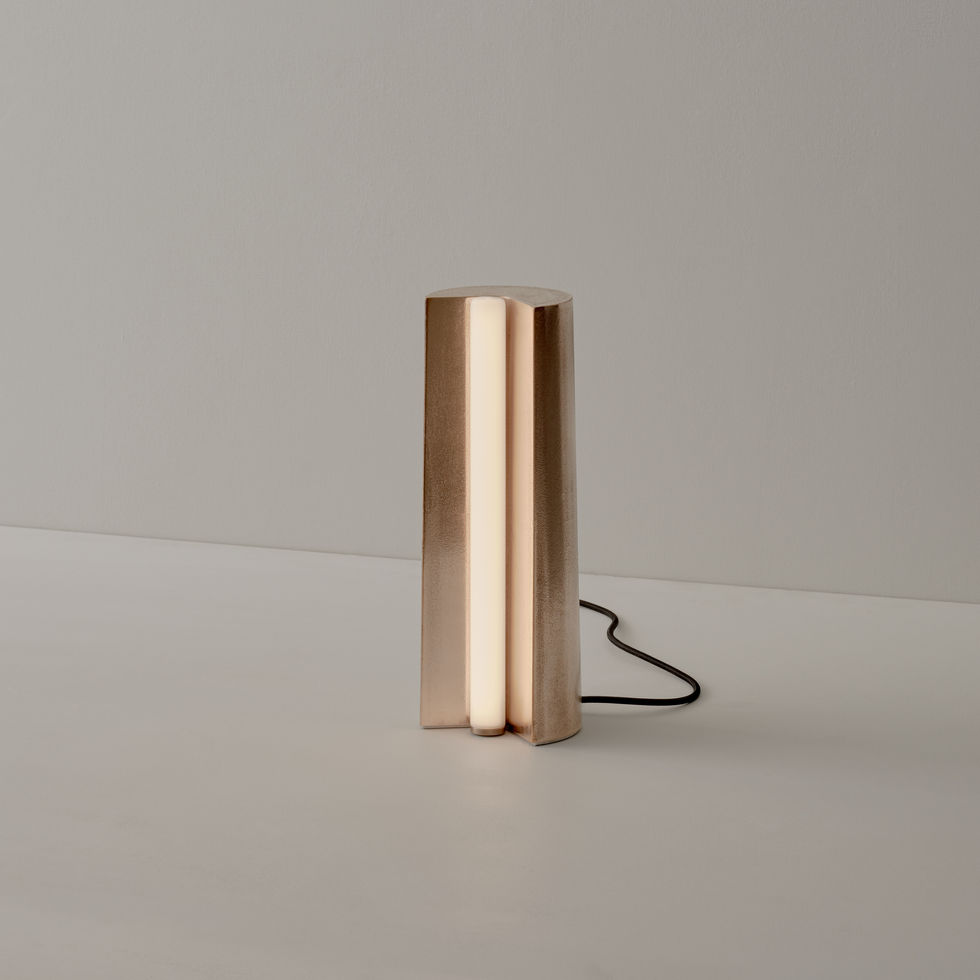 Anton-serien utforsker støpte materialer, bearbeidet for hånd for å fremheve særpreget i hver overflate. Lampen lyser opp fronten og kaster lyset mykt fremover. Tableton Tall Aluminium og Gunmetal støpes som ett stykke aluminium. Spor fra sandstøpeprosessen setter sitt preg på overflaten og gir hver Tableton sin unike tekstur. Overflaten kan stå ubehandlet eller halvpoleres for å fremheve en dempet glans.