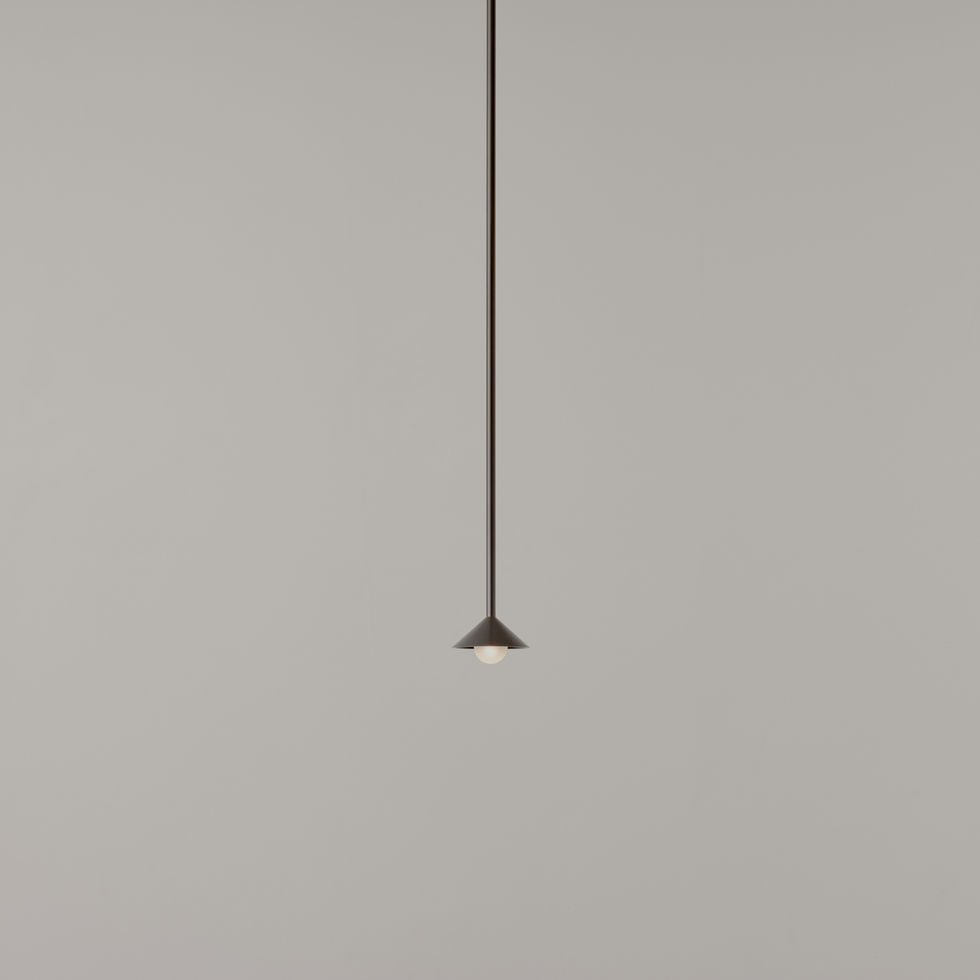 The Pyramid Scheme features tiered conical shades, punctuated by a linear framework. The collection is a contemporary take on classical geometries. Baby Drop is a tiny pendant full of delicate details, with a frosted glass diffuser that peers out from beneath the solid brass shade. Shown in Bronzed Brass finish.