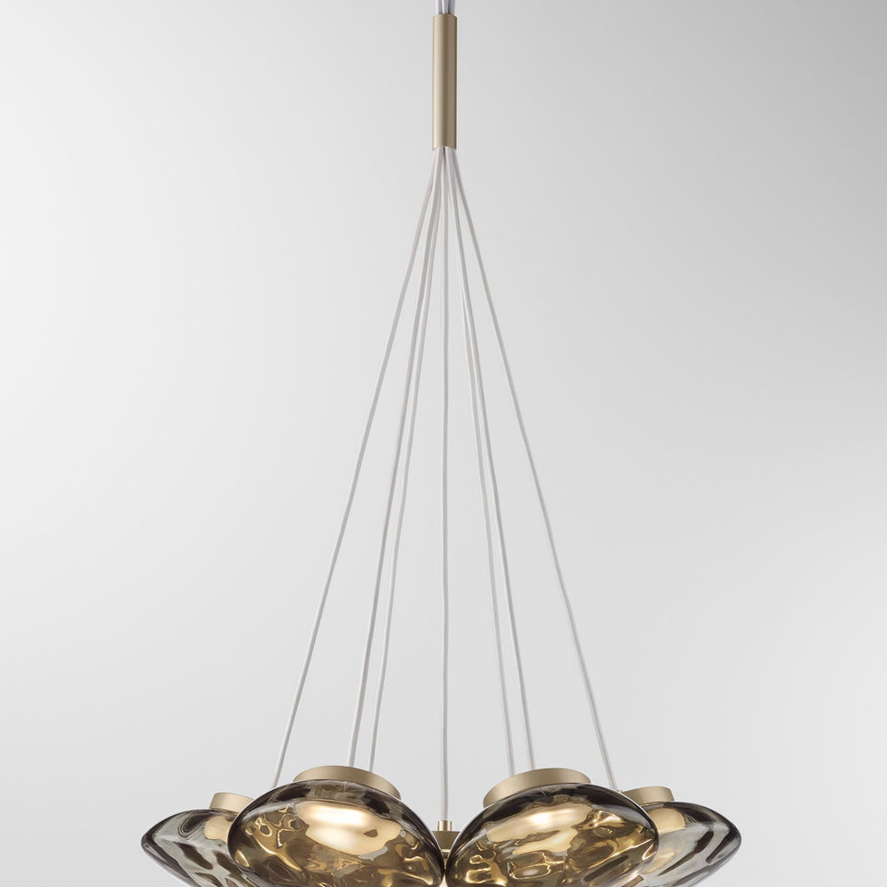 Ceto fanger bevegelsen og de bølgende mønstrene fra havets overflate. Serien utforsker det dype samspillet mellom lys og vann, og består av fortryllende lamper som gjenspeiler havets kraft og ro. Hver lampe har sitt eget unike mønster og avgir et mykt, stemningsfullt lys som gjenspeiler havets bevegelser og nærvær. Formen er både skulpturell og elegant, utviklet gjennom eksperimentering med tradisjonelle teknikker for optisk glassblåsing kombinert med moderne ingeniørkunst. Hver lampe får sitt særpreg gjennom selve blåseprosessen, noe som gir glasset en levende overflate. Ceto Cluster lysekrone sprer et bredt og dempet lys som faller mykt ned i rommet. Den leveres i et utvalg munnblåste glassvarianter, kombinert med en presist bearbeidet lampebase i anodisert sort eller champagne.