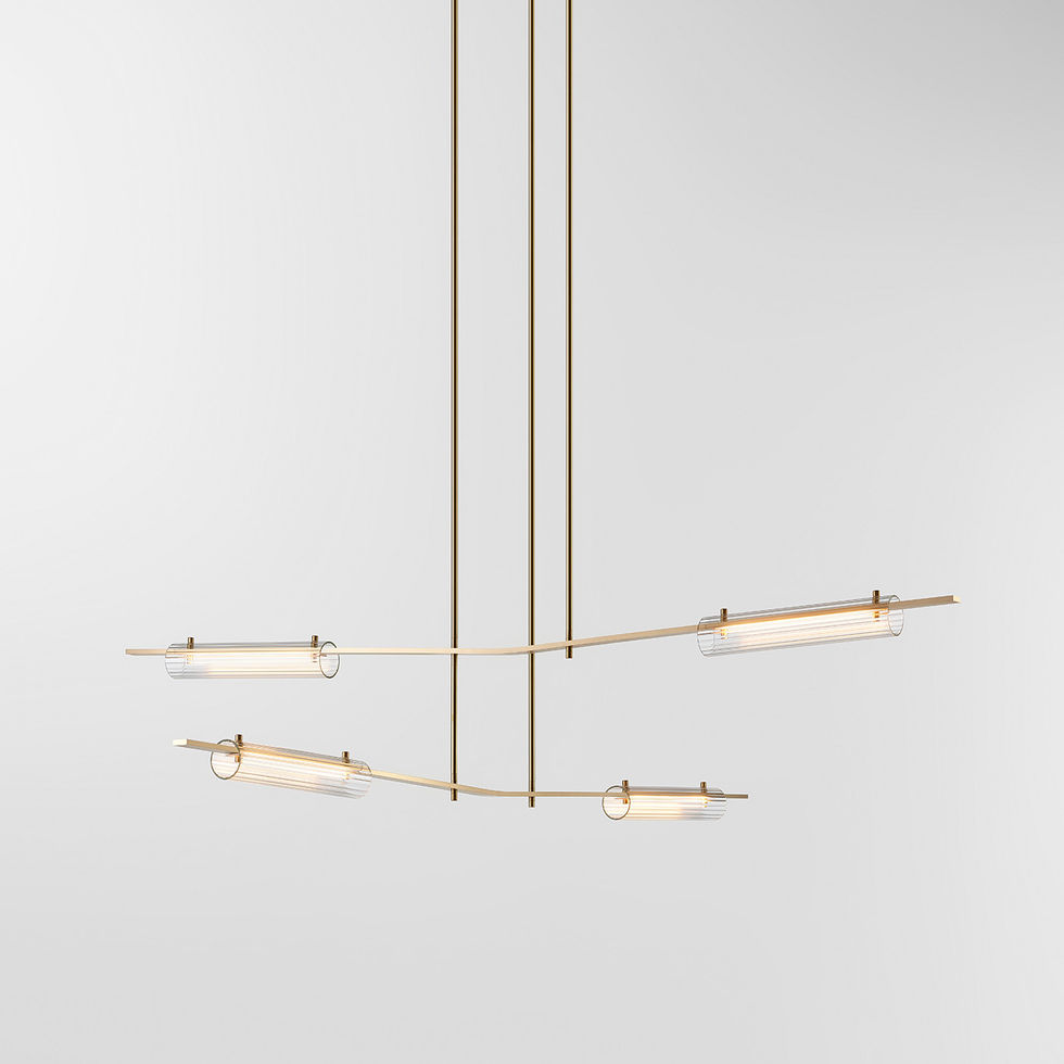 Volant er en moderne lysekrone med et uttrykk som gir assosiasjoner til en skulptur i bevegelse. Selv i ro skaper lampen en følelse av flyt og rotasjon. Massive messingstaver bærer teksturerte, sylindriske glasselementer, vinklet slik at de ser ut til å sveve og sirkle rundt hverandre. Resultatet er en elegant balanse, både visuelt engasjerende og beroligende. Volants modulære og arkitektoniske design gjør det enkelt å tilpasse armaturen til ulike interiørmiljøer. Hver messingstav er dreid individuelt, og en hvit sylinder i glass utgjør lyskilden. Den festes med presise detaljer i messing, som også bærer de teksturerte glasselementene og skaper et karakteristisk lysuttrykk. Den horisontale utgaven Volant 21 og 32 egner seg spesielt godt over spisebord, kjøkkenøyer og andre langstrakte rom. Alle messing- og glasselementer produseres i Australia og monteres for hånd i studioet i Melbourne. Volant er tilgjengelig i flere glassutførelser, kombinert med håndpolert messing, brunert messing og sortbehandlet messing med vokset overflate.