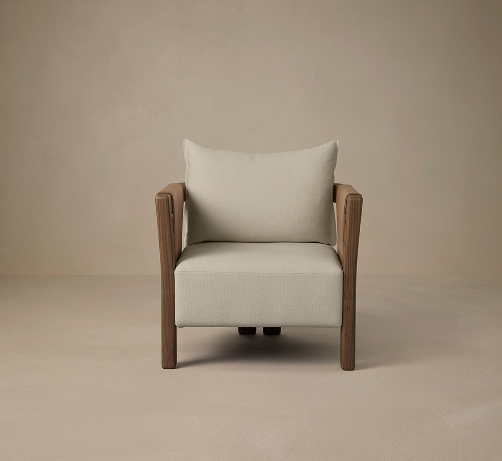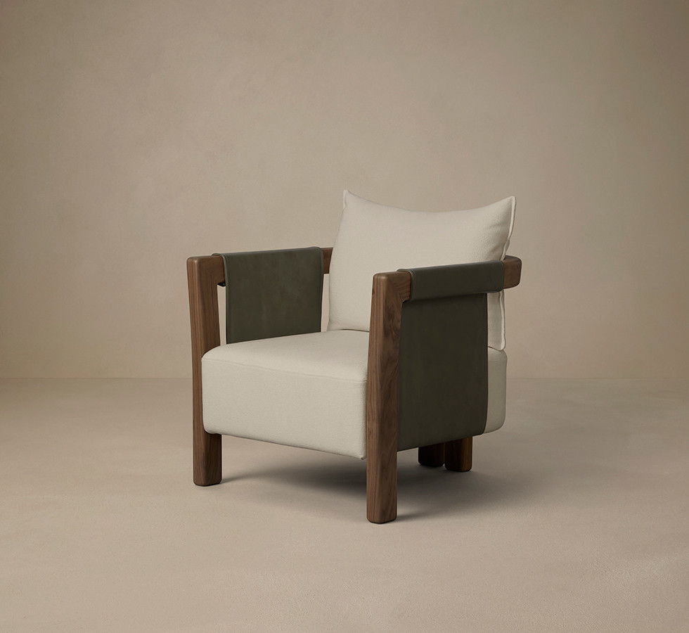 Aptly named Saddle, cushions clad in a linen composite renowned for its durable properties are suspended in a stain-proof leather sling uniting two solid walnut legs. Handcrafted by artisans who share a meticulous devotion to proportion and comfort, each piece is united in detailing reminiscent of saddlery and practices of the earliest Milanese ateliers. The collection comprises the Saddle Armchair, Saddle Bench, and Saddle Ottoman. The result is a series of elegant furniture pieces that can be layered to command and ground the most volumetric of interior spaces. Saddle is suitable for residential, hospitality and commercial projects.
